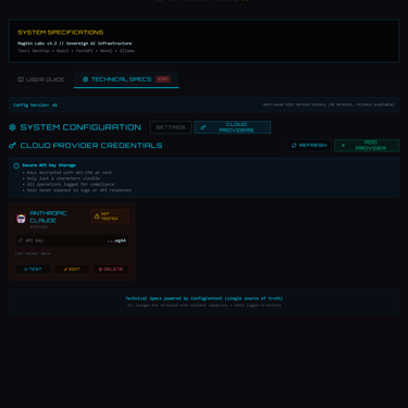 The API Key Vault stores credentials in an encrypted SQLite database using sqlcipher with AES-256. Keys are masked in the UI, audited on every access, and never logged. The implementation provides what environment variables cannot: audit trails, a management interface, and the foundation for per-provider spending limits. While PostgreSQL handles application data, I chose a local encrypted SQLite file for secrets to ensure the key vault remains portable and decoupled from the container stack, adhering to the isolation principle established in Desk v4.